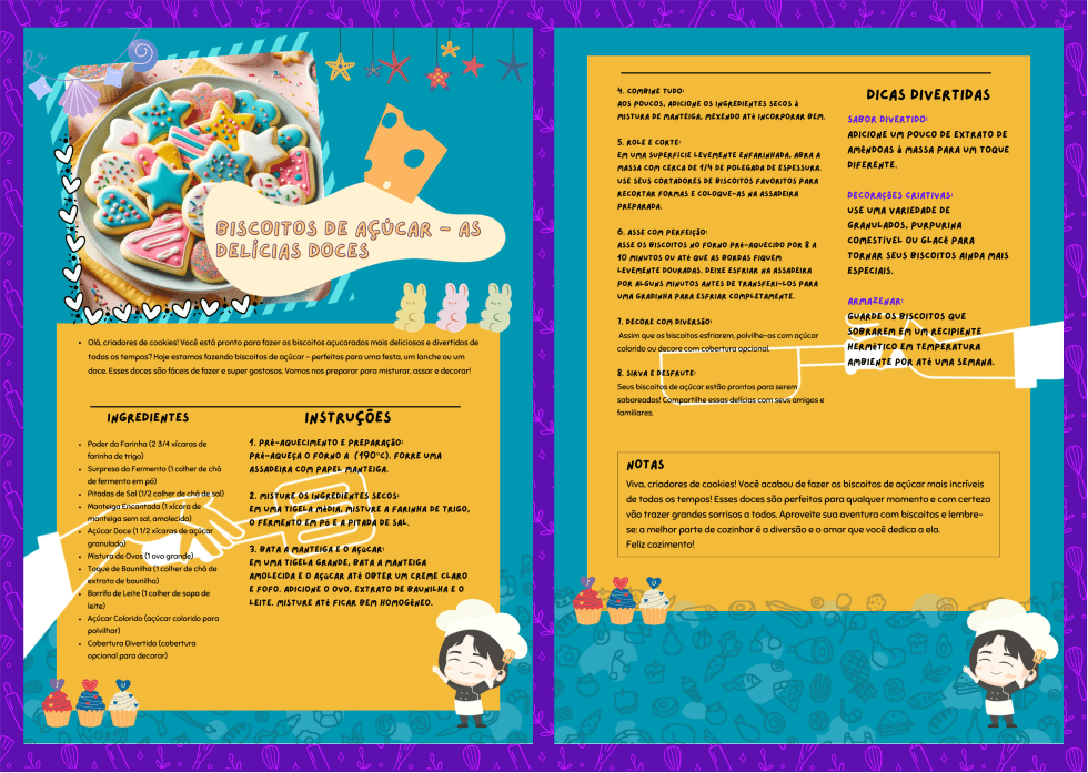 Oi, pequenos confeiteiros! Preparem-se para fazer os biscoitos de açúcar mais deliciosos de todos os tempos. Perfeitos para qualquer ocasião, essas delícias são fáceis de fazer e super gostosas. Cozinhar juntos é uma ótima maneira de pais e filhos se conectarem, darem risadas e criarem doces lembranças. Vamos misturar, assar e decorar! Feliz confeitaria!