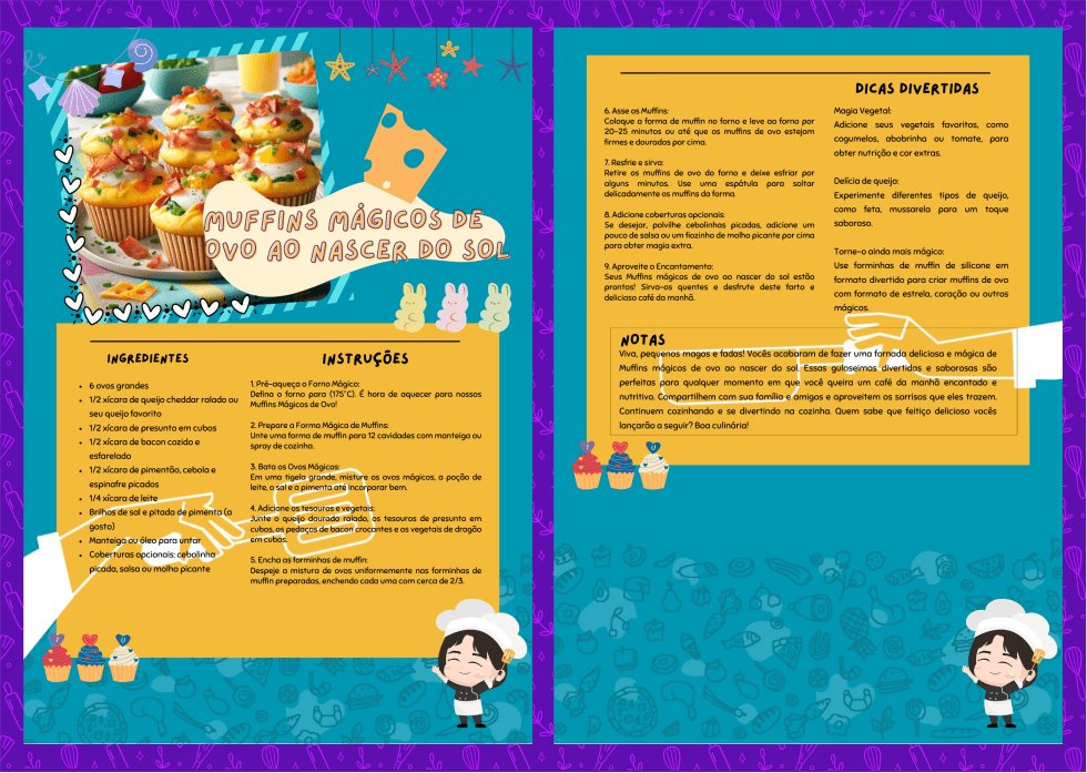 Oi, pequenos magos e fadas! Vamos preparar um café da manhã encantado com nossos Muffins Mágicos de Ovo ao Nascer do Sol. Esses muffins são perfeitos para começar o dia com um toque de magia. Fácil de fazer e delicioso de comer, esta é uma ótima maneira para pais e filhos se divertirem na cozinha. Vamos assar, saborear e se deliciar!