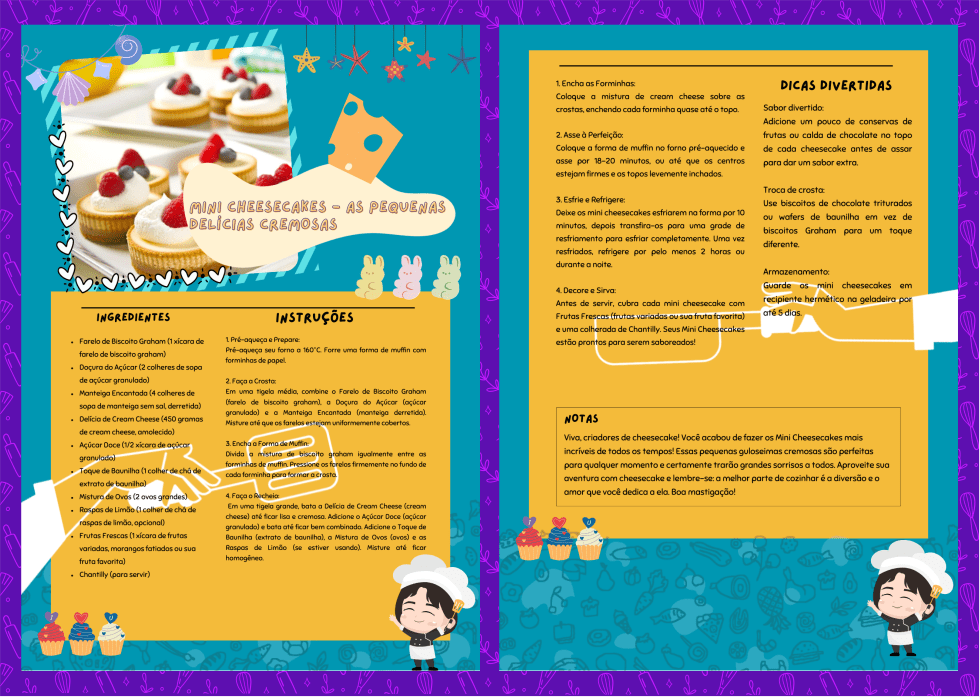 Oi, pequenos confeiteiros! Preparem-se para criar Mini Cheesecakes – as pequenas delícias cremosas que vão fazer todos sorrirem! Esses mini cheesecakes são perfeitos para qualquer ocasião e super fáceis de fazer. Junte os ingredientes e comece a aventura na cozinha com seus mini chefs. Vamos misturar, assar e decorar! Feliz confeitaria!