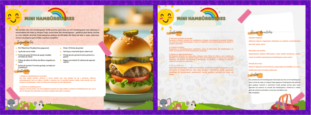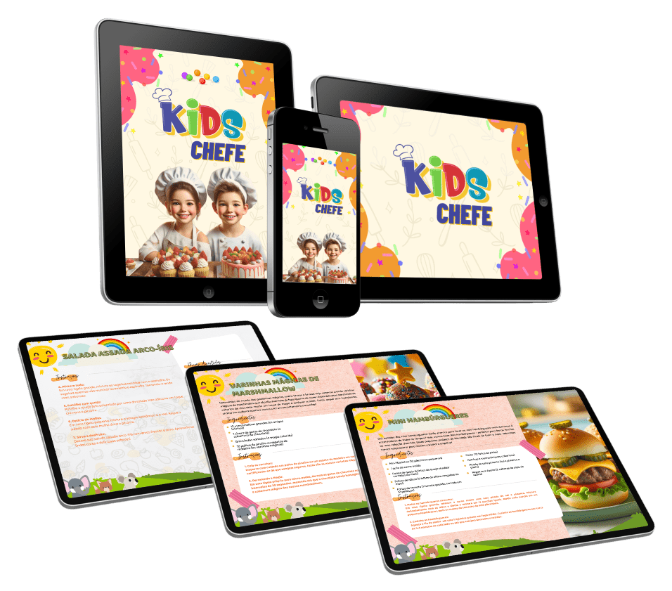 O “Kids Chefe” traz 100 receitas perfeitas para pequenas mãos e grandes imaginações. Cada uma com um layout lindamente desenhado e temas divertidos para crianças. As receitas estão disponíveis em PDF de alta resolução que você também pode imprimir.