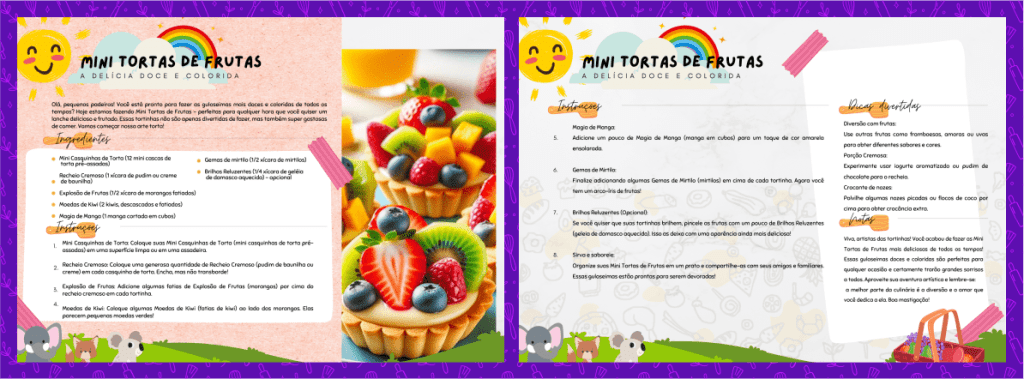 Olá, pequenos padeiros! Você está pronto para fazer as guloseimas mais doces e coloridas de todos os tempos? Hoje estamos fazendo Mini Tortas de Frutas – perfeitas para qualquer hora que você quiser um lanche delicioso e frutado. Essas tortinhas não são apenas divertidas de fazer, mas também super gostosas de comer. Vamos começar nossa arte torta!